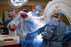 Dr. Amit Persad performing Saskatchewan’s first stereotactic robotic epilepsy surgery.